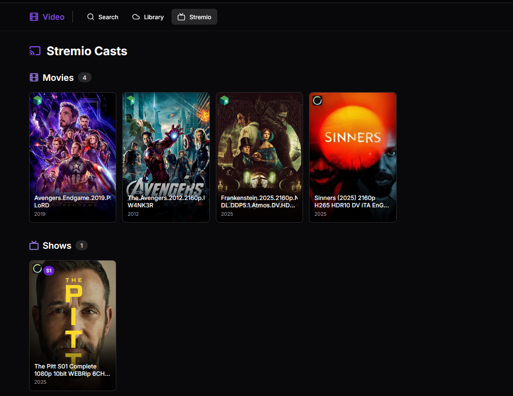 | Management & Support: Manage or remove casted items via the Stremio tab on the Video page. Supports Usenet and Web downloads (via TorBox) with proper indexers. | New Feature: Use the Stremio tab to track all active streams. |