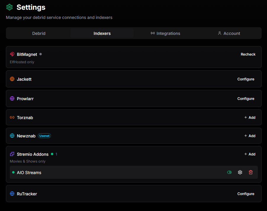 | You can configure Stremio addons in the indexer section. This allows you to search for movies and shows using your Stremio addons for even more indexing. | ![]() |
