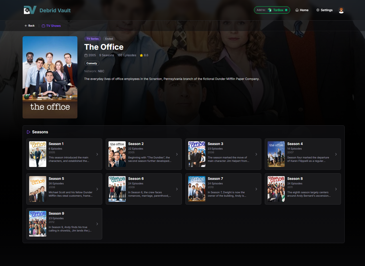 | Use the intuitive UI to find TV shows and movies quickly. Search and play your favorites without ever leaving Debrid Vault. | ![]() |